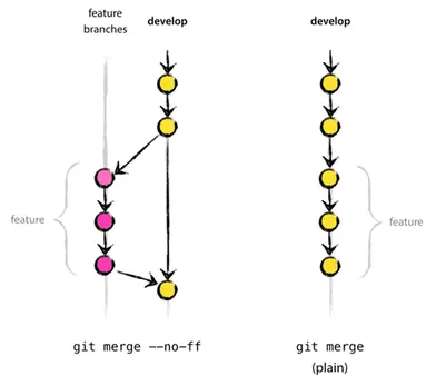 在图中右边那种情况中,一旦完成合并,你将再也无法从 develop 的 Git 记录中分辨出哪些 commit 是来自 feature 分支中提交的修改和增加的新功能了,这意味着如果你想要找出这些 feature 的提交内容,你必须一条一条地在所有提交历史中去找到对应的提交记录。而在这种合并模式下,如果想要撤销整个新功能,那就够你头疼的了。如果你使用了 —no—ff 就可以完全避免这种合并,并且可以轻松地回退。