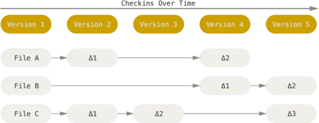 Git 和其它版本控制系统的主要差别在于 Git 对待数据的方式。 从概念上来说,其它大部分系统以文件变更列表的方式存储信息,这类系统将它们存储的信息看作是一组基本文件和每个文件随时间逐步累积的差异(它们通常称作 基于差异(delta-based)的版本控制)。