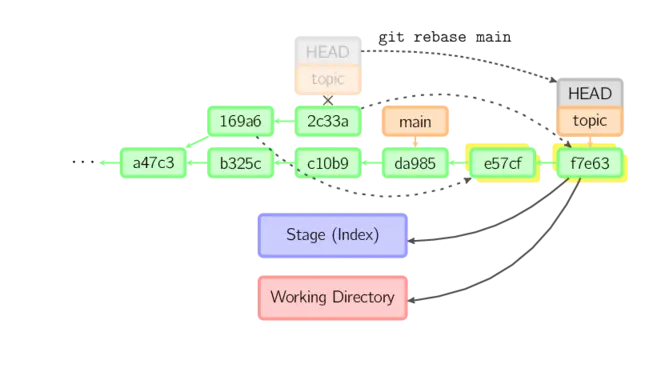 上面的命令都在topic分支中进行,而不是main分支,在main分支上重演,并且把分支指向新的节点。注意旧提交(169a6和2c33a)没有被引用,将被回收。要限制回滚范围,使用–onto选项。