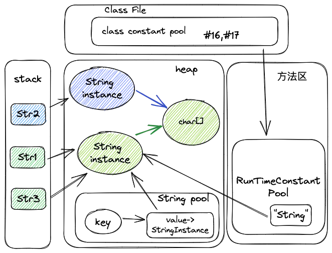 - 然后经过验证,准备阶段之后,在堆中生成字符串常量的实例对象(也就是上例中str1所指向的”string”实例对象),并将这个对象的引用存到全局String Pool中,也就是StringTable中。