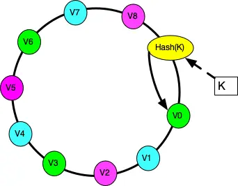- 对于关于 k的映射,求出 z=hash(k), 标记在环上: