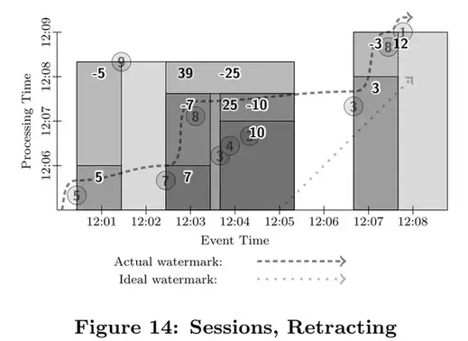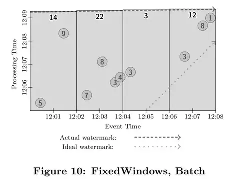 我们之前曾经说过,数据已经被完全处理的标记经常和数据的准确性是相互冲突的,因此,我们不会太过于依赖于水位线。不过,它确实是一种有用的手段。系统可以用它猜测所有事件发生时间早于水位线的数据已经完全被观察到。应用可以用它来可视化处理时间差,也用它来监控系统总体的健康状况和总体处理进展,也可以用它里做一些不影响数据准确性的决策,比如基本垃圾回收策略等。