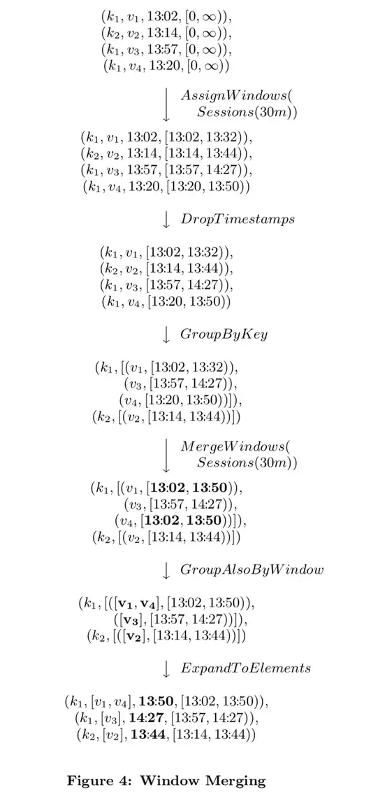 - MergeWindows – 窗口合并。把同一个键的(值,窗口)进行窗口合并。具体的合并方式取决于窗口策略。在这个例子中,窗口v1和v4重叠,因此会话窗口策略把这两个窗口合并为一个新的,更长的会话窗口。(如粗体所示)