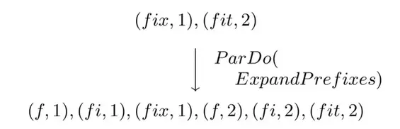 - ParDo 用来进行通用的并行化处理。每个输入元素(这个元素本身有可能是一个有限的集合)都会使用一个UDF进行处理(在Dataflow中叫做DoFn),输出是0或多个输出元素。这个例子是把键的前缀进行展开,然后把值复制到展开后的键构成新的键值对并输出。