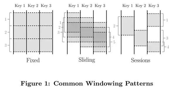 窗口操作把一个数据集切分为有限的数据片以便于聚合处理。当面对无边界的数据时,有些操作需要窗口(以定义大多数聚合操作需要的边界:汇总,外链接,以时间区域定义的操作;如最近5分钟xx等)。另一些则不需要(如过滤,映射,内链接等)。对有边界的数据,窗口是可选的,不过很多情况下仍然是一种有效的语义概念(如回填一大批的更新数据到之前读取无边界数据源处理过的数据,「类似于Lambda架构」)。窗口基本上都是基于时间的;不过也有些系统支持基于记录数的窗口。这种窗口可以认为是基于一个逻辑上的时间域,该时间域中的元素包含顺序递增的逻辑时间戳。窗口可以是对齐的,也就是说窗口应用于所有落在窗口时间范围内的数据。也可以是非对齐的,也就是应用于部分特定的数据子集(如按某个键值筛选的数据子集)。图一列出了处理无边界数据时常见的三种窗口。