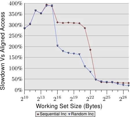 图6.7显示了使用现在熟知的指针追逐框架(pointer chasing framework)的测试结果。列表在内存中随机排列。与之前测试的不同之处在于,程序实际上在每个列表节点上花费了一些时间(大约160个周期)。正如我们从图3.15中的数据中了解到的,一旦工作集大小大于最后一级缓存,程序的性能就会受到严重影响。