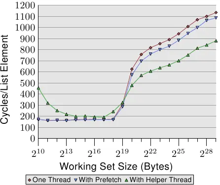 这个基准测试的结果可能令人惊讶(也可能不是)。如果工作集适合L2,帮助线程的开销会降低10%到60%的性能(主要是在低端,再次忽略最小的工作集大小,噪音太高)。这应该是意料之中的,因为如果所有数据都已经在L2缓存中,预取帮助线程只使用系统资源而不会对执行做出贡献。