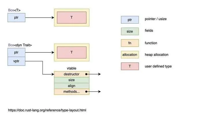 • 虽然特征对象没有固定大小,但它的引用类型的大小是固定的,它由两个指针组成(ptr 和 vptr),因此占用两个指针大小